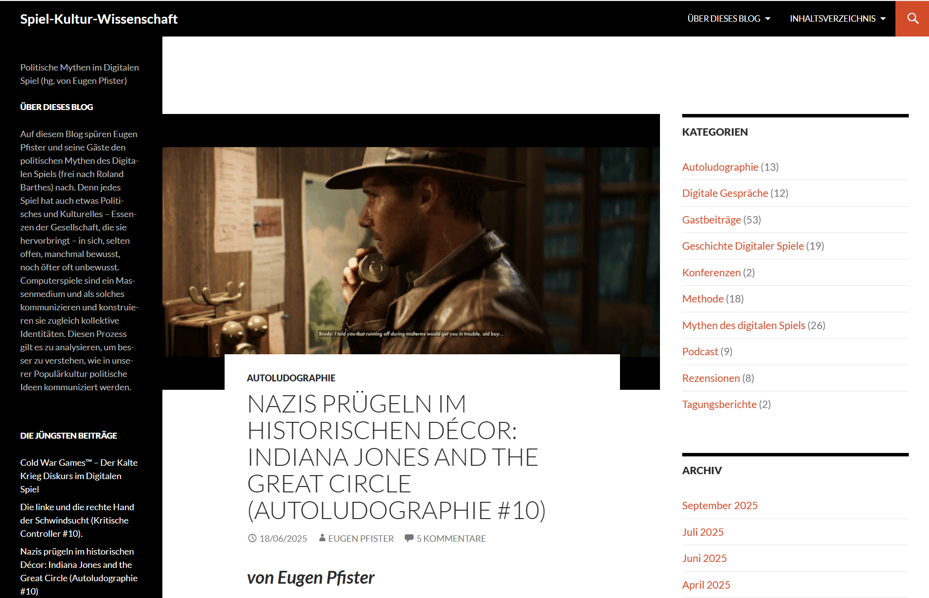 In seinem neuesten Blog-Beitrag eröffnet unser Vereinsmitglied Eugen Pfister einen kulturwissenschaftlichen Blick auf das Indiana-Jones-Franchise. Am Beispiel des aktuellen Videospiels Indiana Jones und der große Kreis zeigt er, wie persönliche Nostalgie, Popkultur und gesellschaftliche Botschaften miteinander verflochten sind.