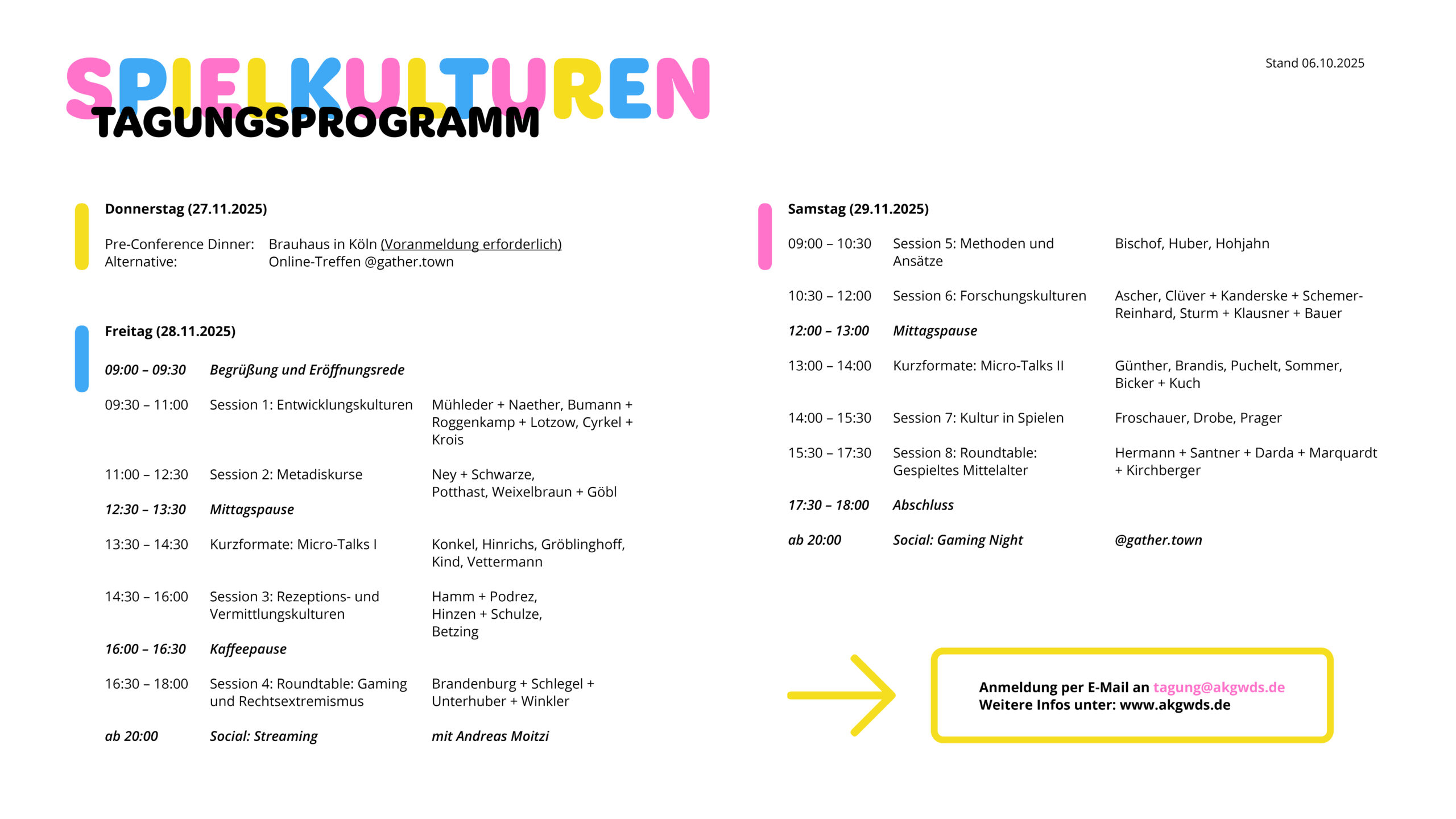 Wir freuen uns auf zwei Tage intensiven Austauschs, spannender Diskussionen und neuer Perspektiven auf das Medium Spiel!