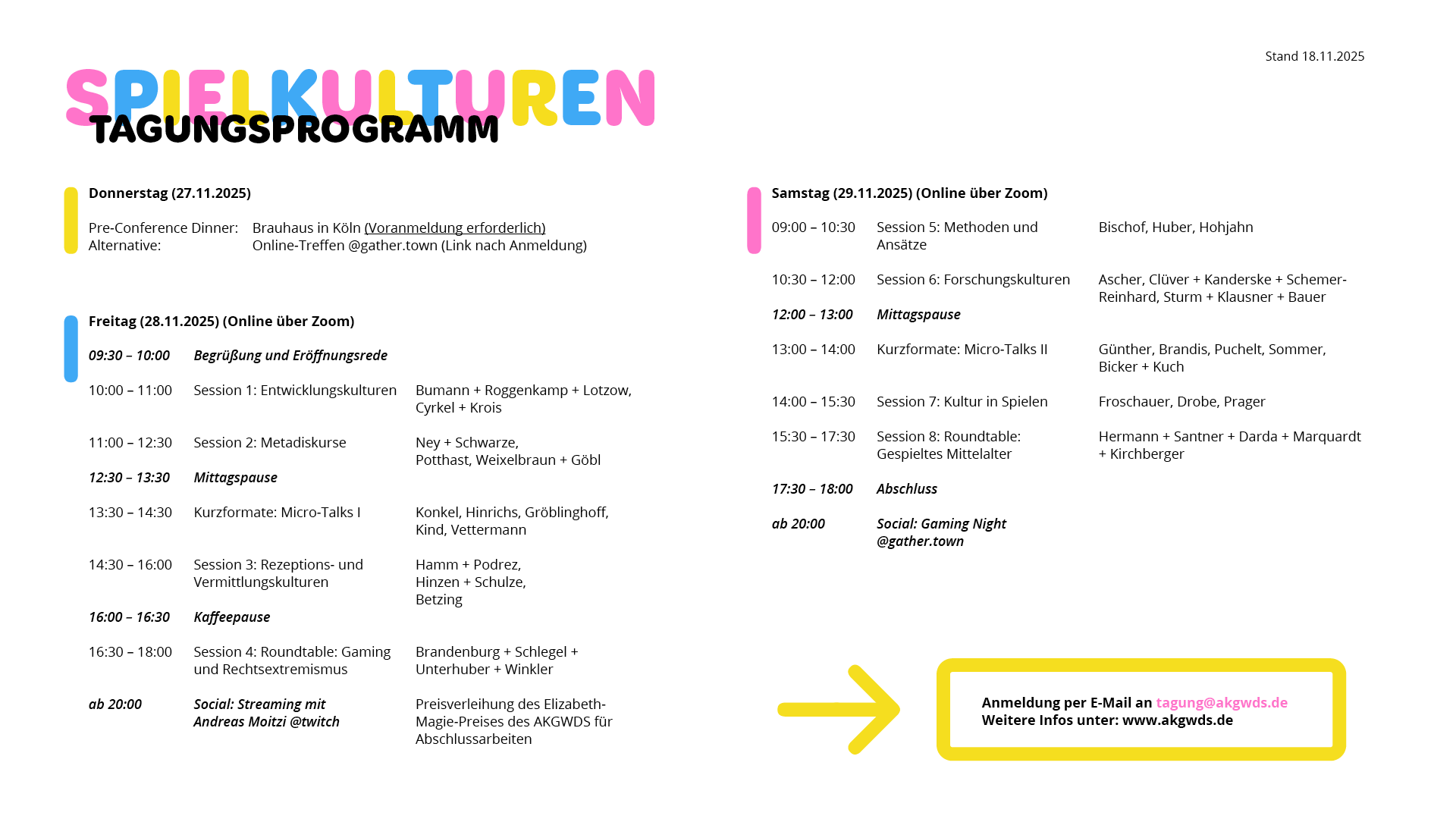 Wir freuen uns auf zwei Tage intensiven Austauschs, spannender Diskussionen und neuer Perspektiven auf das Medium Spiel!